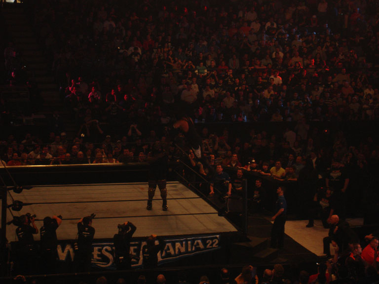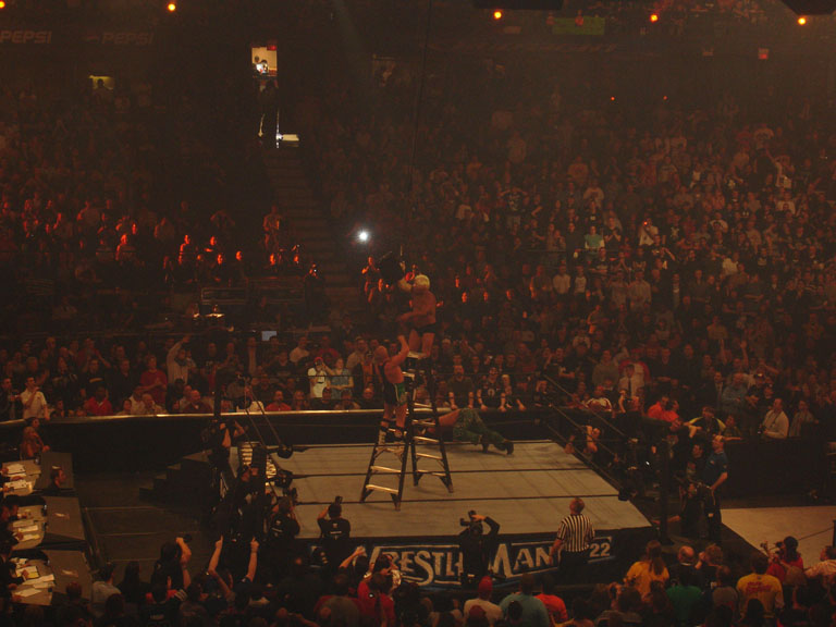 Flair being suplexed off the lader |
